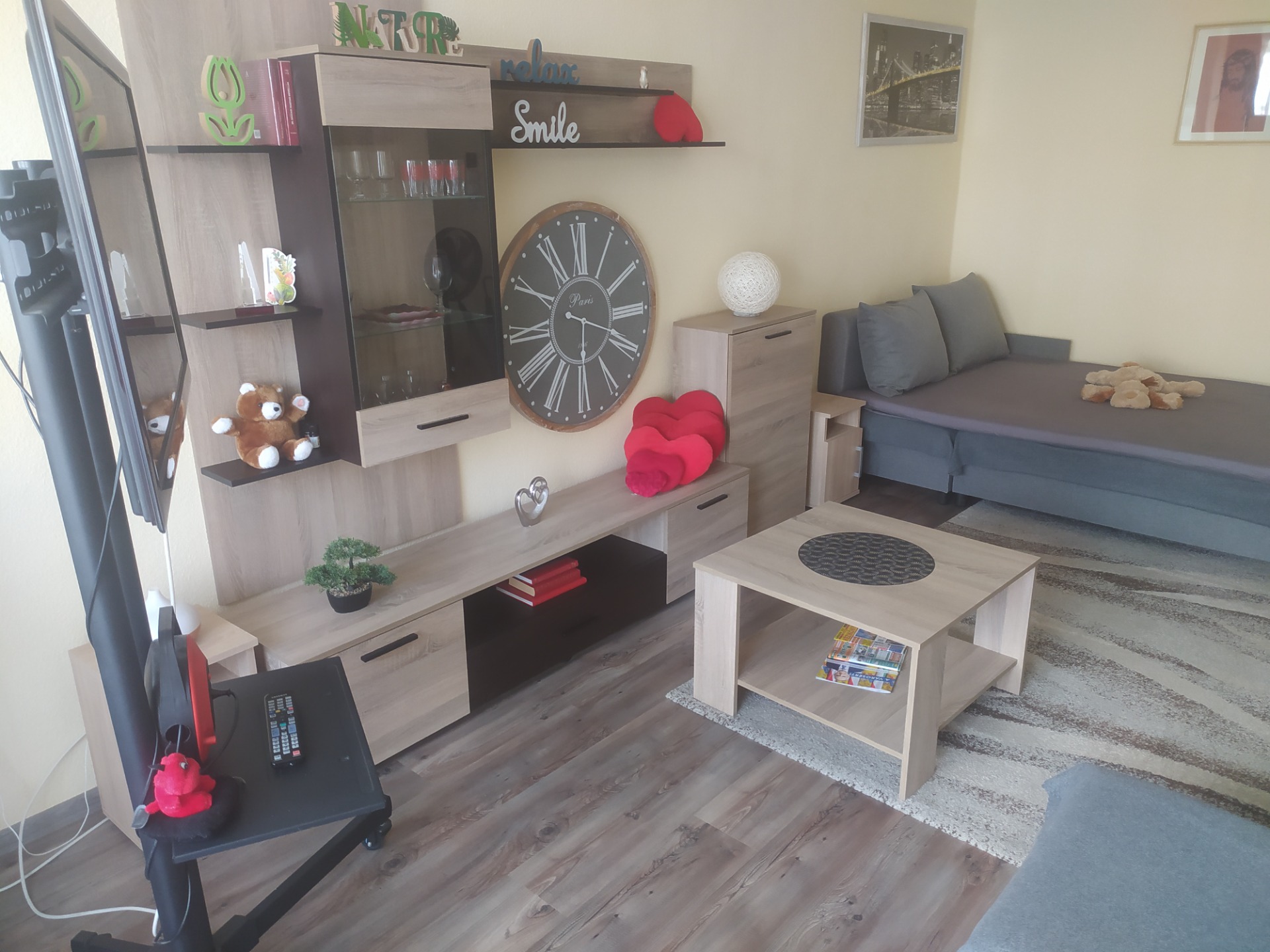 A lakás az 1. emeleten található mely 55nm-es. Helyiségei: két külön bejáratú szoba, erkély, nagy konyha, fürdő, valamint wc külön helyiségben. A lakás nagyon jól felszerelt: nagy Smart Tv minden szobában